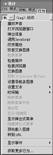 2. 選中圖片,單擊行為標(biāo)簽,在此面板中,點(diǎn)擊“增加事件”按鈕,出現(xiàn)下拉菜單,如圖所示。