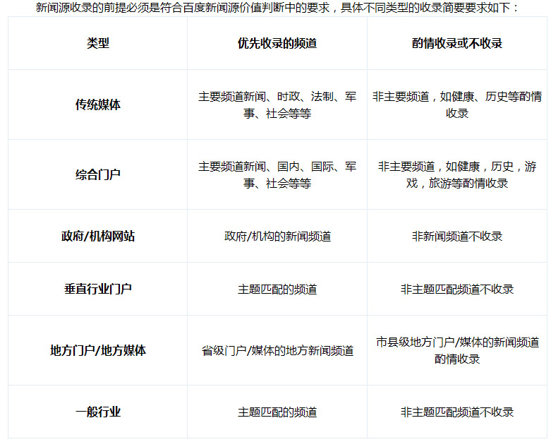 新聞源收錄的前提必須是符合百度新聞源價(jià)值判斷中的要求,具體不同類型的收錄簡(jiǎn)要要求如下: